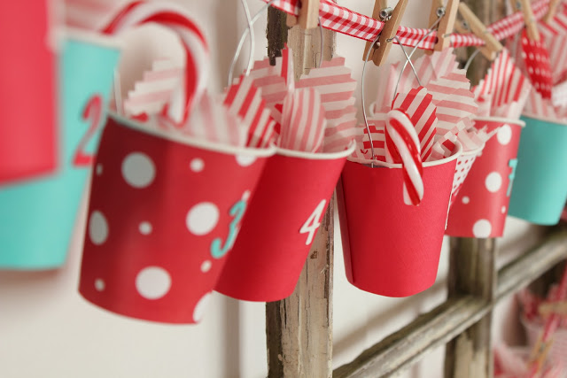 Просто натяните ленточку, повесьте на нее стаканчики с помощью прищепок, заполните их выбранными Вами мелочами, и Ваш адвент-календарь готов!
