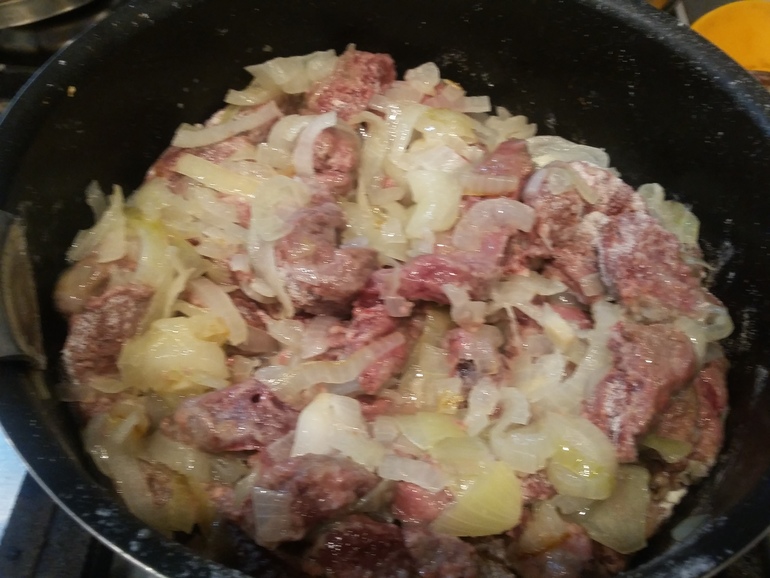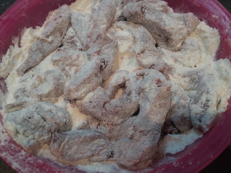 Смешать соль и муку, обвалять в этой смеси печенку: