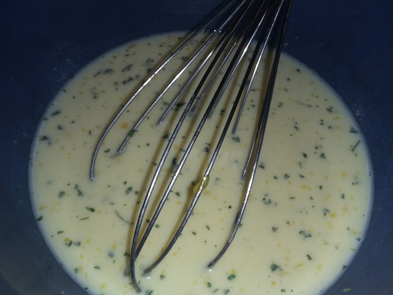 Взбить желтки, пармезан, немного зелени петрушки, сливки 35%: