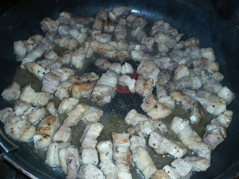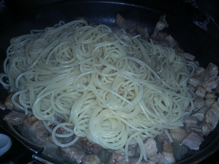 Нарезать грудинку (копченую, вяленую) брусочками. В оливковом масле обжарить дольку чеснока, затем чеснок вытащить и обжарить грудинку: