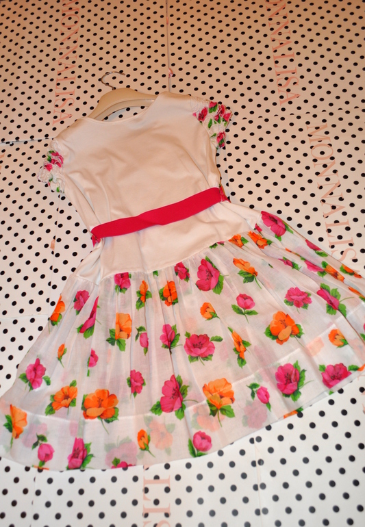 Очень легкое, нарядное платье. Верх выполнен из трикотажа( 100% cotton), юбка из х.б, тонкого и летящего. Юбочка пышная, с глубокими частыми складками.