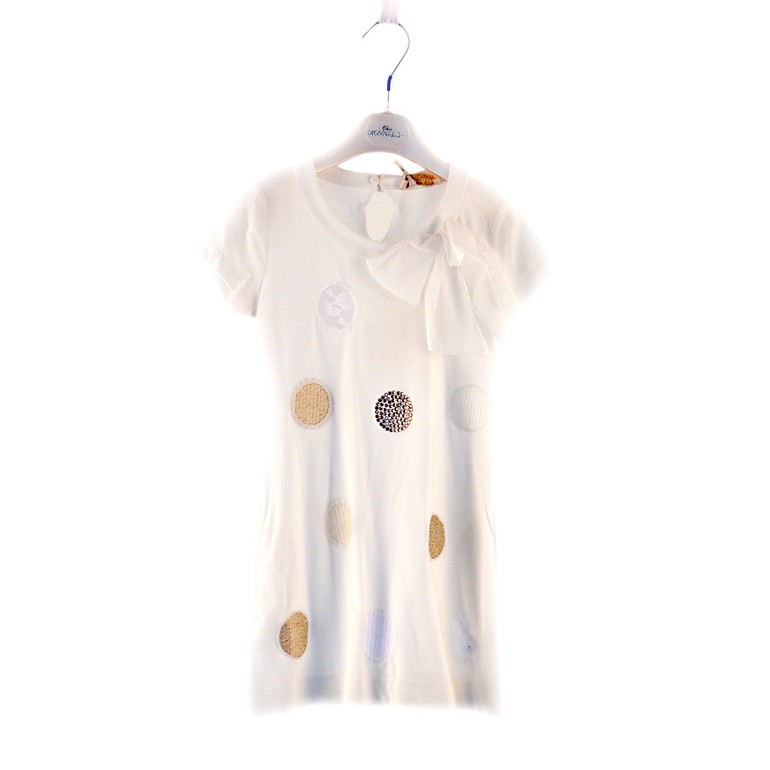 Туника MONNALISA CHIC размер 8 лет, рост 128 см. Трикотаж. Цвет молочный. Модель с кармашками. Принт выполнен из разнотканных кругов, а также кругом из страз и бантом.