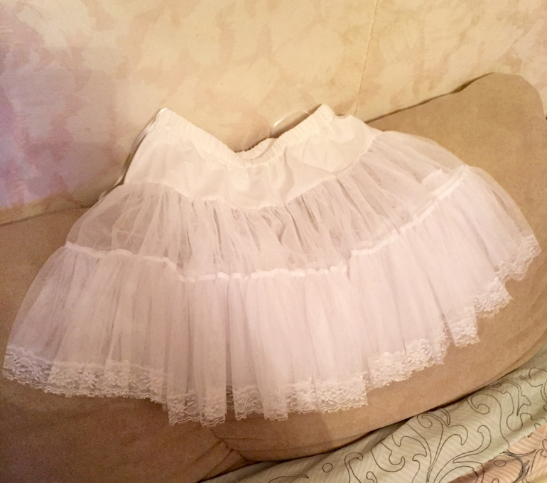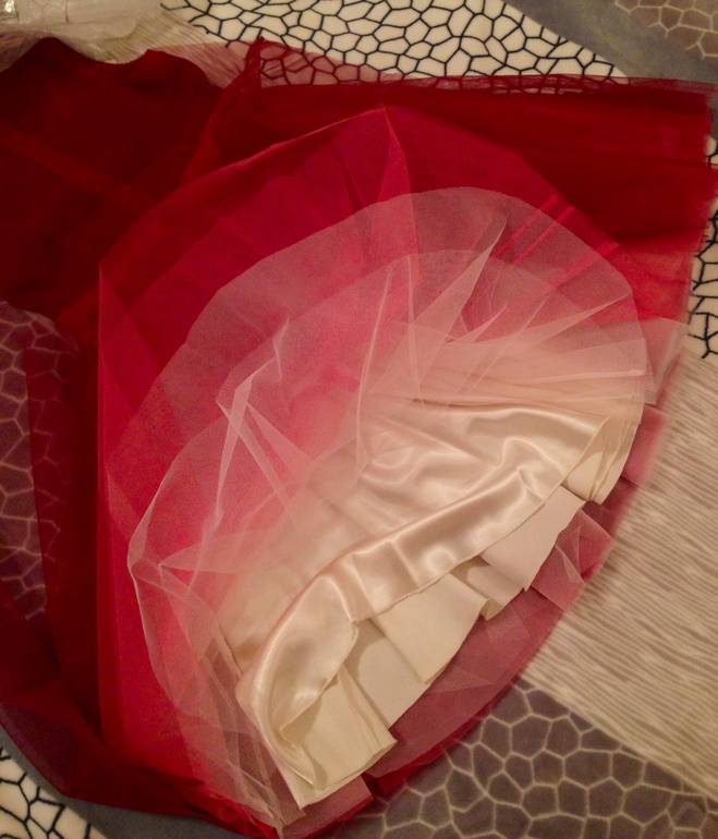 Юбка из семи слоев: два слоя в цвет платья, два слоя в розовом цвете, два слоя кремового цвета и шелковая нижняя юбка.
