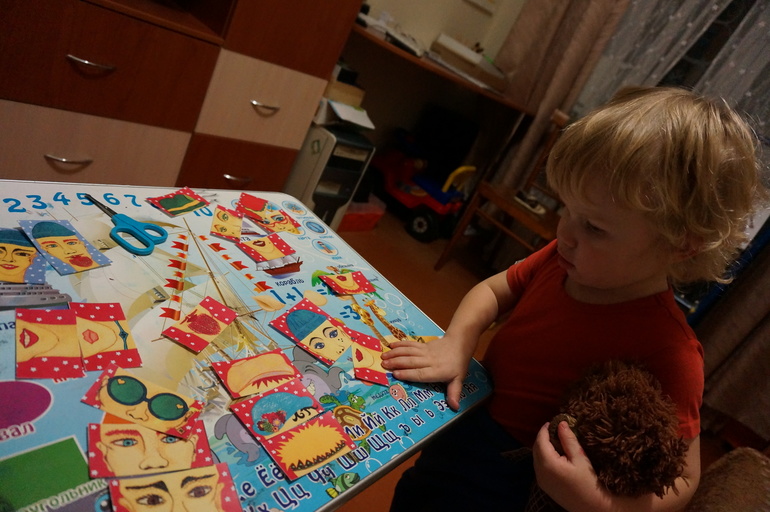 - На лото тоже не соглашался, ноя все же его вытащила и положила на стол и в процессе заинтересовался и стал выполнять. В процессе обсудили для чего нужны уши, глаза, рот, нос, проговорили 5 "органов чувств"