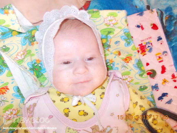 Вчера были на контрольном приёме в микробке. Врачиха там классная, Настёне тоже нравится. Итог нашего первого лечения : Личико почистилось, газиками не маемся ттт. за 2 недели выросли на 3см и прибавили 350г. Она сказала что это очень хорошо. И теперь началось самое главное лечение ( и самое дорогое ) Через месяц опять к ней. Самый главный вывод из всей этой истории я сделала такой : если вы на ГВ и съели что нибудь не то мама выпейте 2 таблетки угля актевированного и будет вам счастье, а заодно и детке. Ходили к хирургу - стомотологу по поводу уздечки. Нам сказали что у нас всё нормально, нам ничего не мешает и нечего панику разводить, а в поликлиннике занятся врачам нечем. Чему мы очень обрадовались, особенно папа (его слово стоматолог вводит в ступор и он теряет всякую способность нормально мыслить )