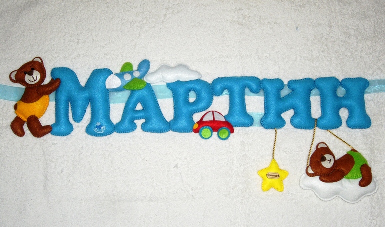 Имя из фетра для двух братиков.Один обожает машинки,а другой любит зверушек.Ну так тому и быть)))