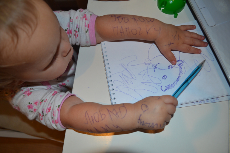 Разговаривает вовсю, вообще не замолкает. Пытается повторять каждое слово, некоторые звуки не понимает, как произнести, говорит ерунду, но чаще всего повторяет сразу и запоминает мигом. Предложениями пока редко говорит («мама моя», «папа пойдем», «папа бай-бай» и т.п.). Мы очень много разговариваем, я стараюсь проговаривать ей все, что вижу и все, что мы делаем. Повторяю по несколько раз каждое слово, а она повторяет за мной. Очень мило стала звать нас с мужем: мамака (мамочка) и папака (папочка). Почему-то в этих словах не может произнести «Ч», хотя «яичко» произносит четко.