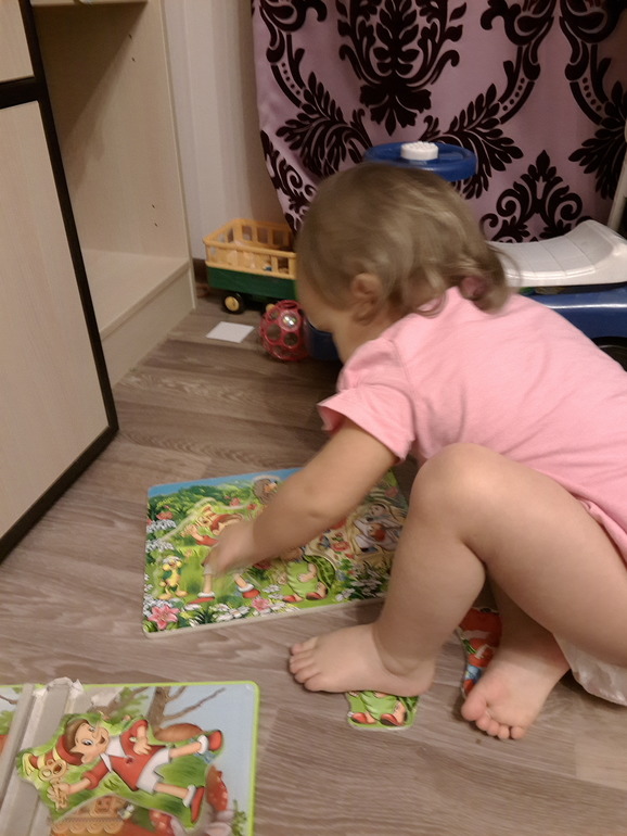 Знает стихотворения, но об этом я писала уже в предыдущем после. Любит рисовать, в последнее время часто сажаю ее рисовать в ванну, у нас для этого специальные восковые мелки-карандаши для ванной, также рисует на бумаге, в фаворе фломастеры и ручки. Любит читать книжки, читает и сама, и слушает чтение других. Складывает полностью сама деревянные паззлы вот такие
