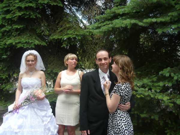 Это мы уже перед ЗАГСом. Моя мама в красном, ее двойняшка - в бежевом