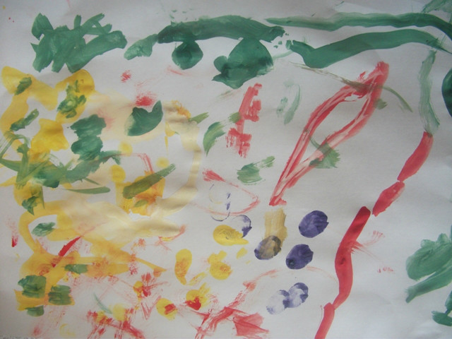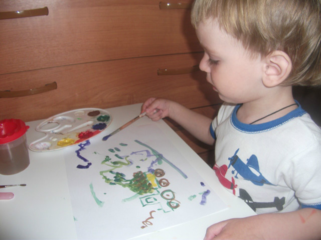 Мишка рисует кисточкой, рисование пальчиковыми красками не пошло сразу, хныкал от того, что руки грязные, говорил "ка-ка" :). Сейчас та же история, если вымажет краской хотя бы один палец, непременно нужно его помыть.