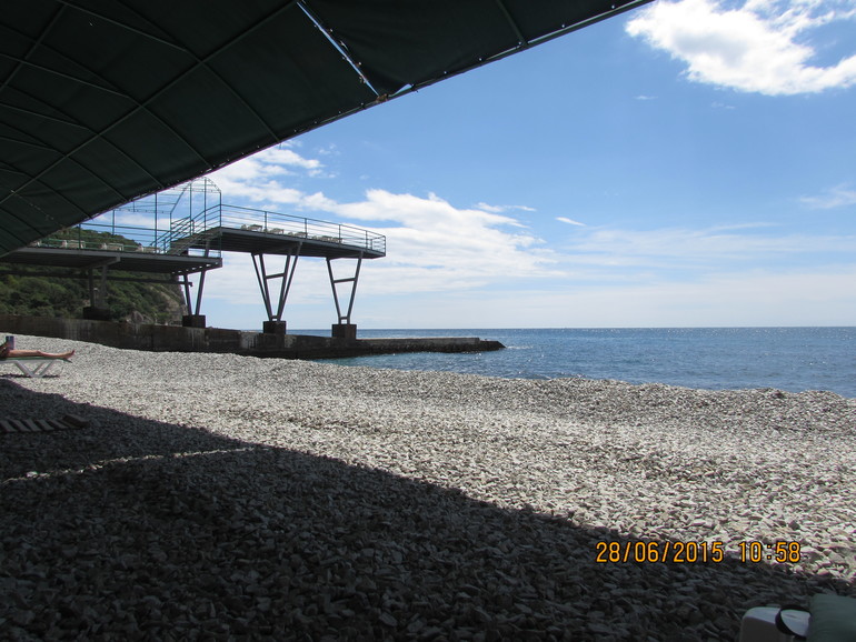 На пляже мы были примерно с 10 до 18 и нам это было удобно. Минус - на пляже свежая галька. Мы брали в аренду шезлонги по 100 руб/день. Ну и спускаться к морю босиком не получится