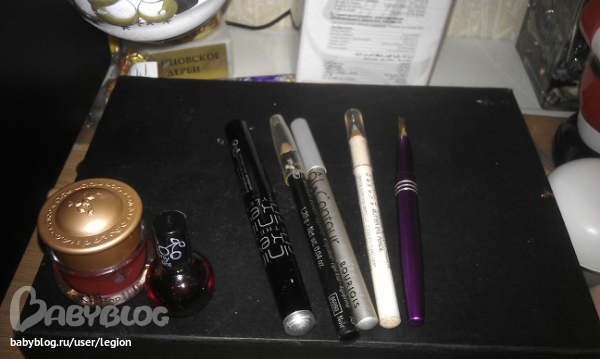 Дальше идут карандаши для глаз ИвРоше и Буржуа, тени-карандаш Миша(серебристые) ,кисточка для помады(фиолетовая)