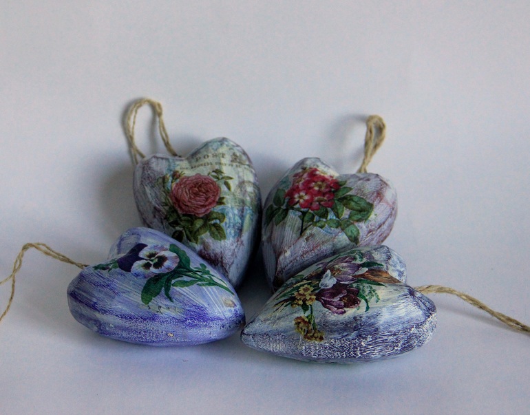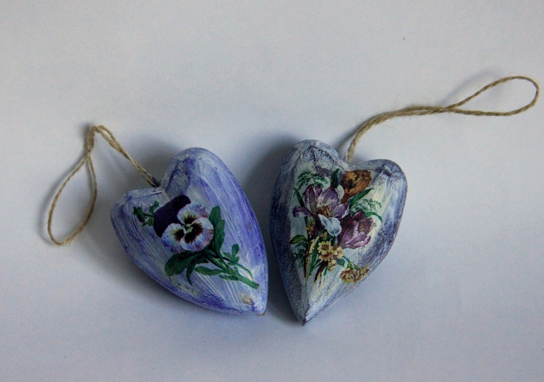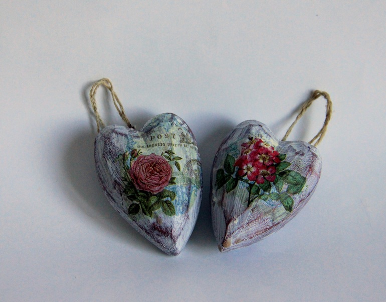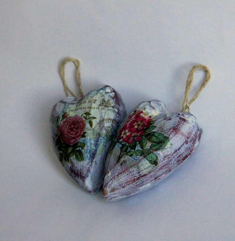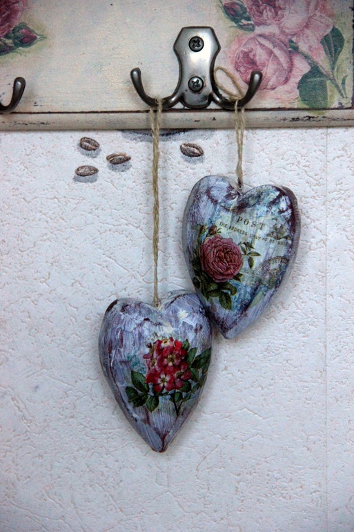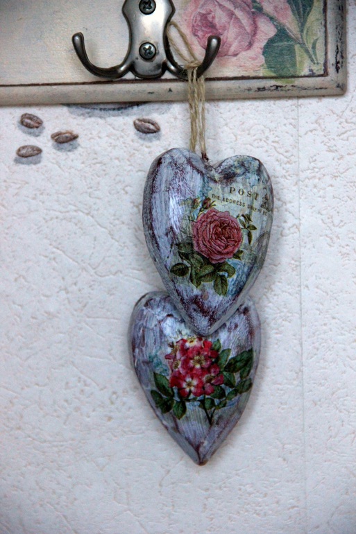 Hand Made by me)))А может, и не ко Дню Св. Валентина, а просто сердечки на кухню, потертые и загадочные. Заготовки из дерева, мне нравятся эти неровные грани)))