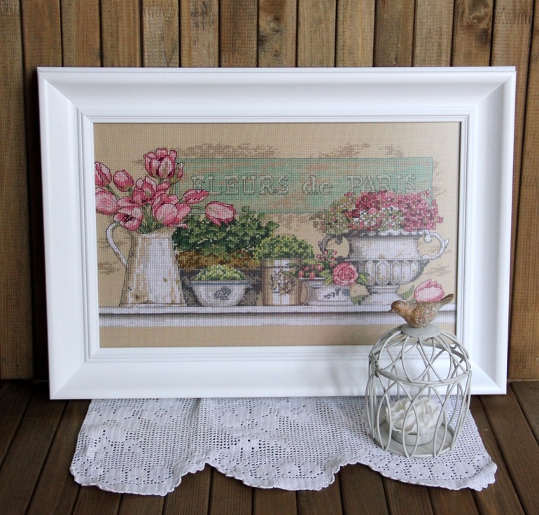 из Бугуруслана на вышивку. "Fleurs de Paris", Наталья приобрела оригинальный набор от Дим. Очень благодарна ей за огромную проделанную работу. Но возможность оформить появилась только сейчас, вдохновил один блог, стильный и легкий, . Конечно же, оформление как в источнике не получилось, слегка потертых рамочек не нашлось. Но широкую белую отыскали, я решила спрятать под стекло от пыли. Вот что вышло: