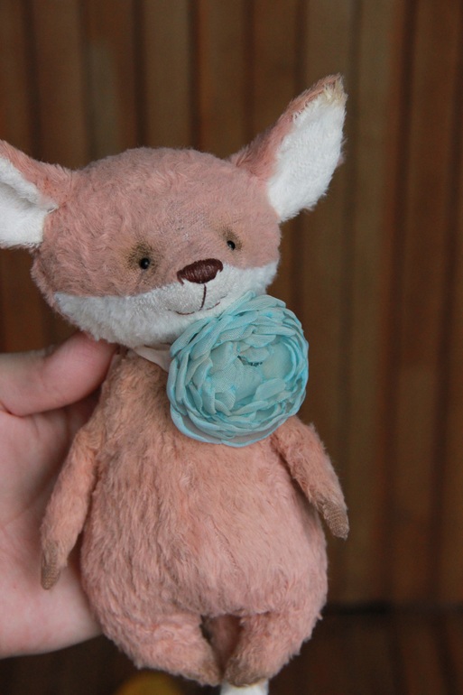 Лисик ростом 17 см, тело цельнокроенное, шплинт лишь в голове. Сшит из вискозы ручного окраса полностью вручную. Очень нежный и добрый, а еще у него мягкое упругое пузо - очень понравилось его тискать)
