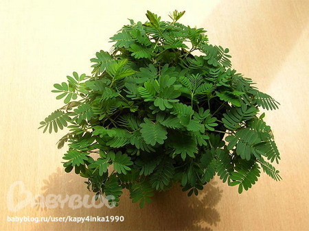 Нежные перистые листья мимозы имеют удивительную изюминку: они реагируют на малейшее прикосновение к ним рукою и на самое маленькое дуновение ветра. С конца июня и до середины осени (при неплохом уходе) растение покрыто нежными розоватыми соцветиями.