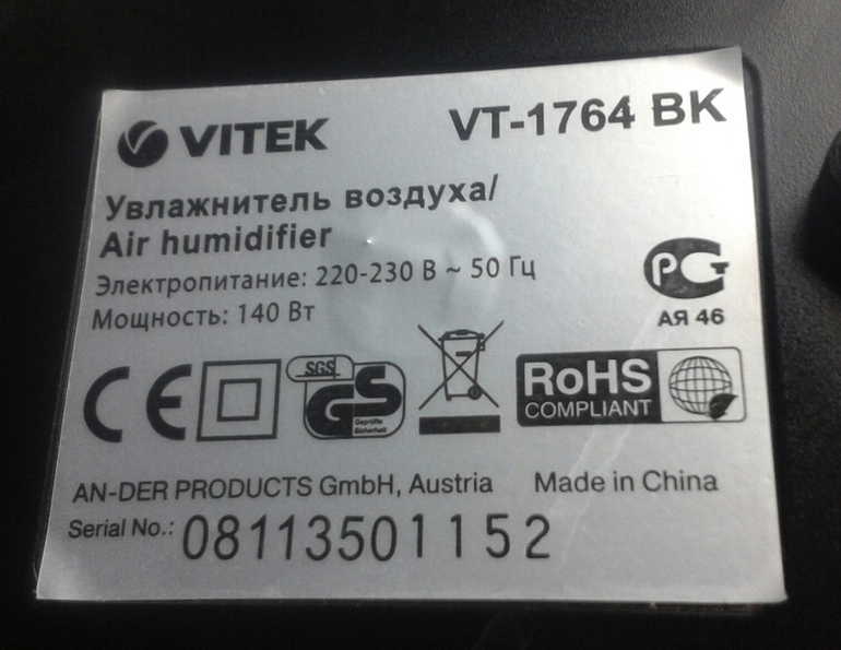 Увлажнитель воздуха vitek VT-1764 BK. 1500 руб