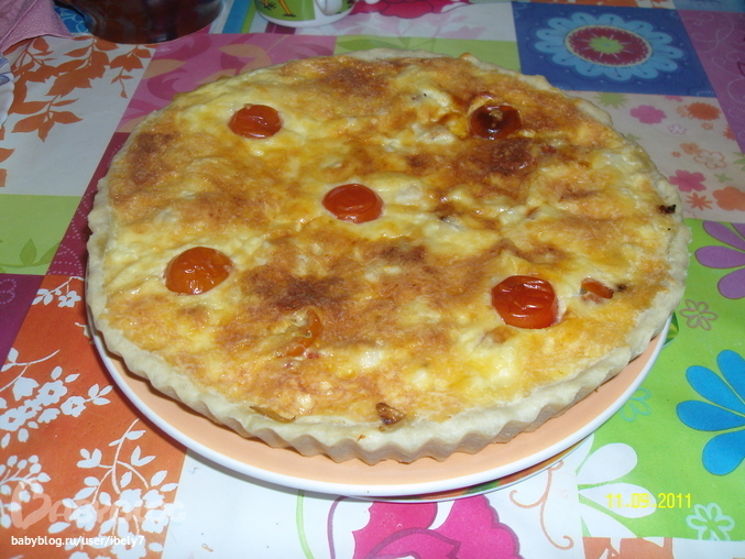 Готовим начинку: отварную курицу мелко режем, нашинкованные шампиньоны и лук обжариваем. Форму для выпекания смазать сливочным маслом и выложить равномерно тесто с бортиками. Выложить на тесто начинку: курицу, лук,грибы, половинки помидор. Продукты для заливки взбиваем миксером и добавляем сверху пирога, не забыв украсить половинками черри. Ставим в духовку на 20-30 минут при 180-200 градусах до появления золотистой корочки. Вот и все, можно встречать гостей!