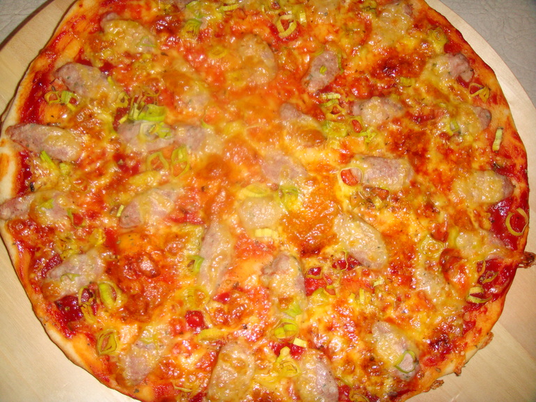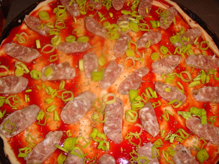 Все подсыхающие кусочки сыра, колбасок и колбасы сразу идут на пиццы, благо тесту всходить не надо и замешивается оно за пару минут. Вот пицца с нюренбергскими колбасками и пореем: