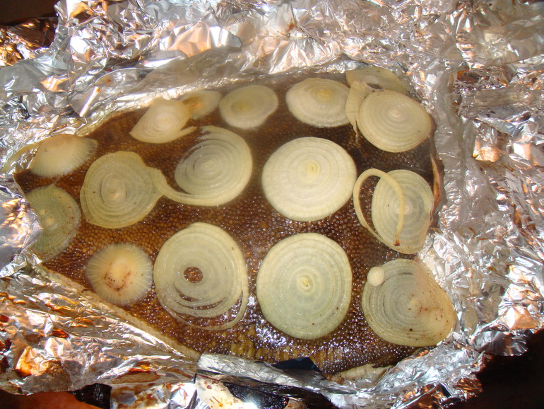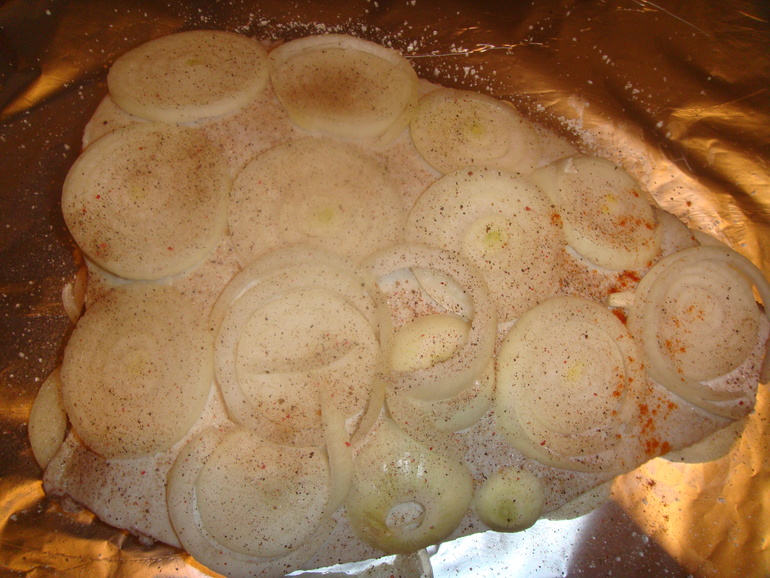 Камбалу просто посолить и обложить кольцами лука: