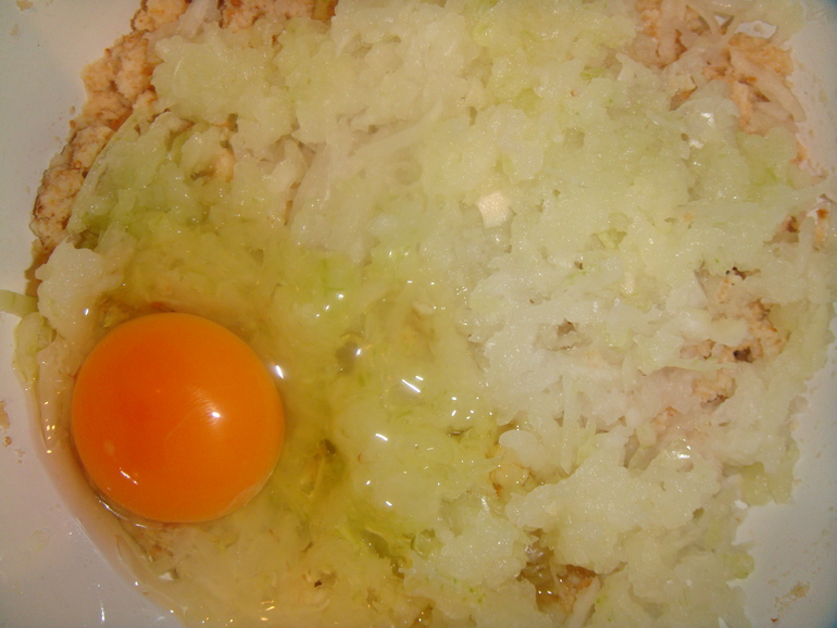 Натереть туда же на крупной терке луковицу, разбить яйцо: