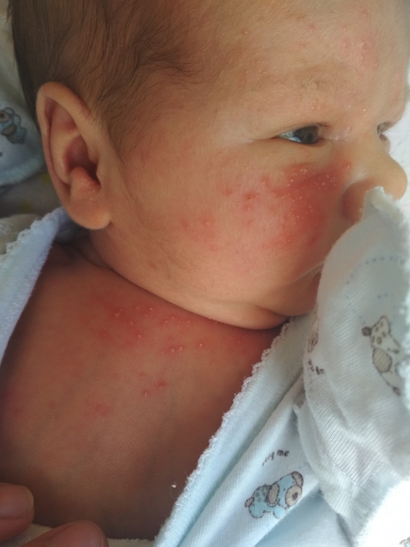 СыпьС самого рождения у малышки было чистое лицо, но как только нам стукнуло 2 недели, на следующий день начали вылезать прыщи(похожи на подростковые) на щеках и на лбу, на следующий день вылезли на голове и на верхней части Груди (фото приложу).. Начиталась что может акне, так как аллергии быть не может, я на строгой диете, и почти ничего не ем.. Шли на Бцж в больницу, нам не поставили так как сыпь, и сказали что аллергия или дерматит.. Укололи синупрет.. Но ничего не прошло полностью.. Они то проходят одном месте, появляются в другом.. Сейчас их стало меньше на лице, они как будто полопались, так как покрылась корочкой кожа и облазит уже, точнее те места где были прыщики.. Теперь вся голова в мелких красных прыщечках, с белой головкой.. И ушки закидало и сзади под шеей тоже.. Что делать! У кого так было!?