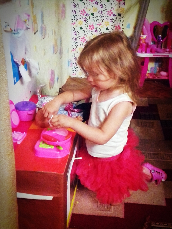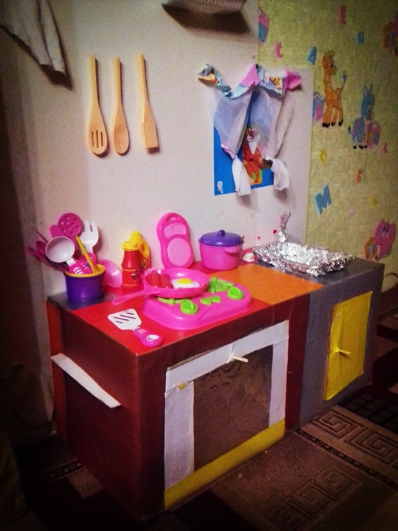 Моя доча увидела кухню как-то в детском мире, но покупать за 12 простите Тыщ ( я знаю, что тысяч, но 12 за кухню это блин конкретно тыщ) ,тогда мы сделали с ней маленькую духовку, но хватило на лето, она не сломалась, просто всякой кухонной мелочи стало больше. Решила я посмотреть , что можно купить побольше, не дорогое, но пока искала, в голову мне пришло совсем другое. И так началось мастерство кухни из подручных средств.