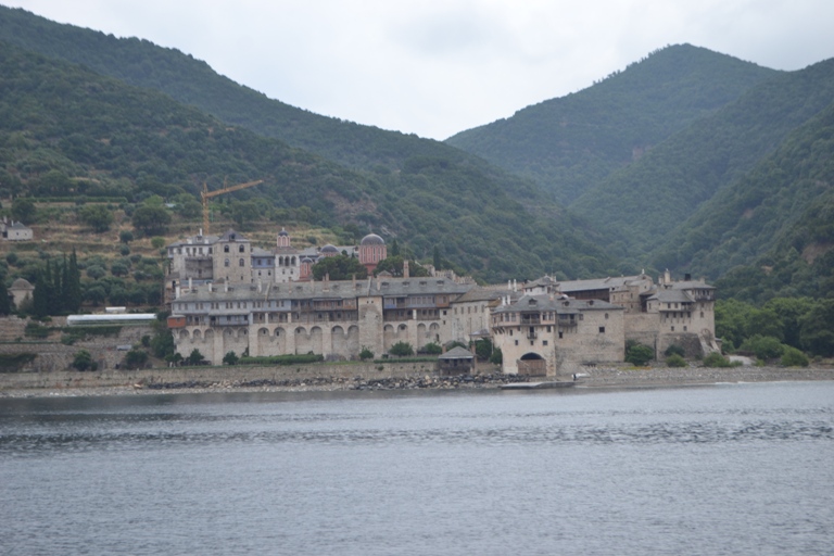 Мы были на Афоне. Посещение горы Афон было обязательной программой нашей поездки. Женщин туда не пускают, поэтому можно проплыть рядом на кораблике и посмотреть из дали на монастыри. Всего их двадцать.