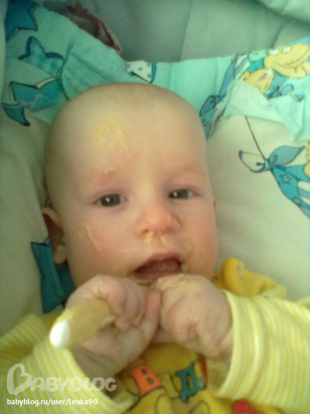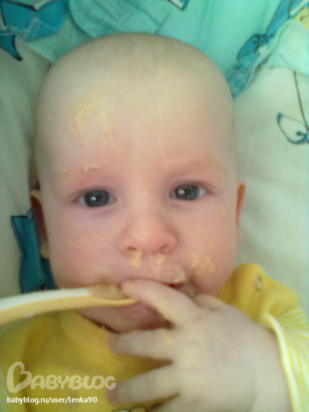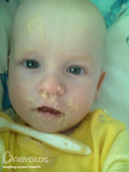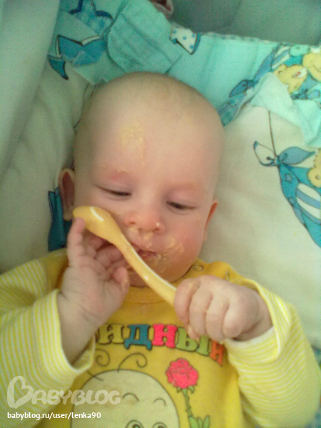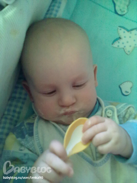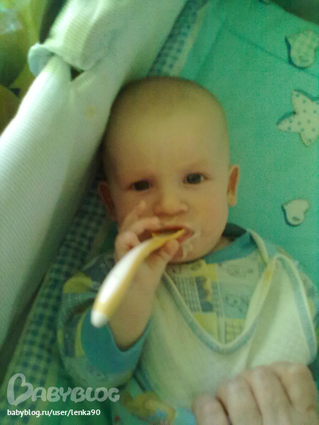 Кухает тоже очень хорошо(тттт). На завтрак кашу, десерт-грудь, обед-овощные пюре(сама делаю) и мясные(пока покупные), ну и конечно десерт, после прогулки грудь, а ближе к 21,00 мы кушаем печенье с творогом, десерт, встречаем папу с работы...и спать...В общем образовался у нас некий режим дня....но бывают сбои..но не всегда... Вечером засыпает сам...без всяких там укладываний..песенок и качаний.... Чему я тоже очень рада))