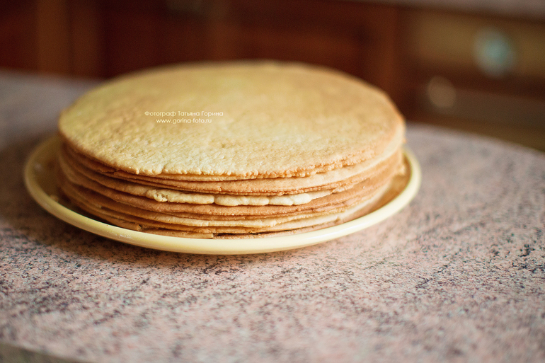 - получится стопка красивых коржей, которые нужно остудить (остудить важно каждый, и только потом их можно сложить стопкой,иначе они слипнутся)