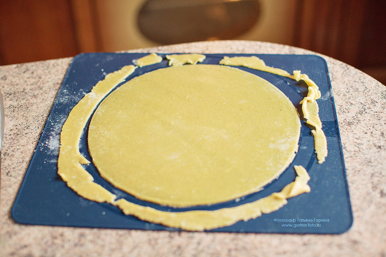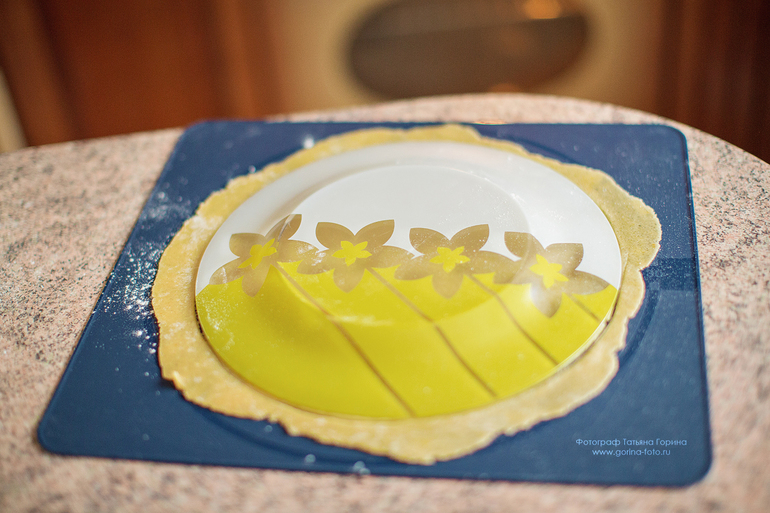 - силиконовый коврик смазать подсолнечным маслом, раскатать (согласно нужной разметке) корж, обрезать его тарелкой, сделать по всему коржу дырки вилкой (чтобы сильно не вздувался); "обрезки" также оставить на коврике, они пригодятся для обсыпки