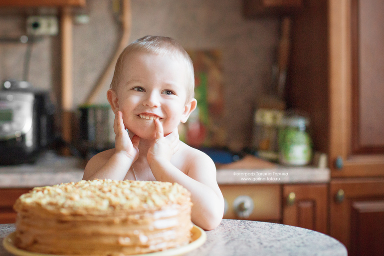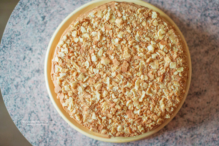 - промазать все коржи кремом, щедро; у меня был помощник :-))) крайний верхний корж также смазать и присыпать сверху растолченными "обрезками" от коржей