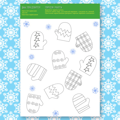 Варежки перепутались. Помоги найти пару для каждой варежки - соедини их линией.