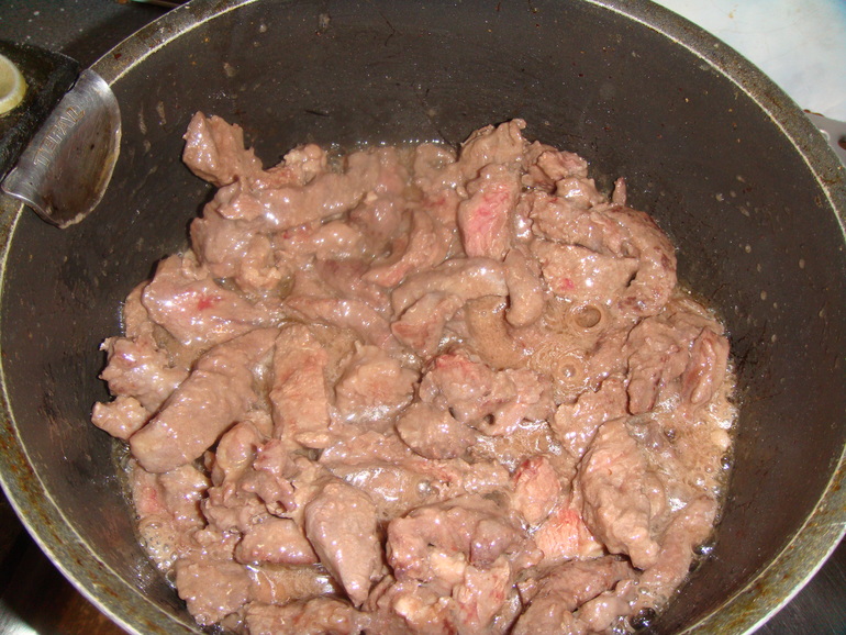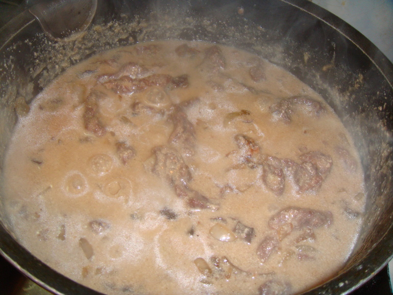 Тушить до мягкости мяса. Подавать предпочтительно с гречей. Но вкусно и с пюре, и с макаронами: