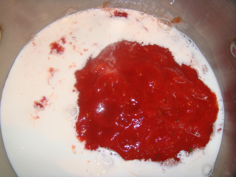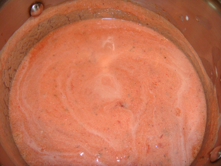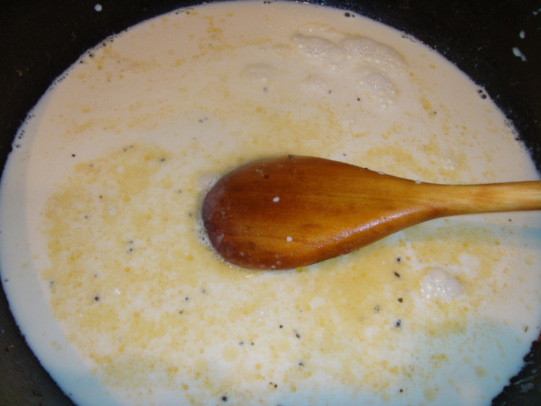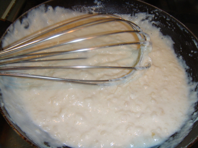 Влить стакан сливой и перемешать венчиком до исчезновения комков (при необходимости протереть через сито). Вылить в сотейник: