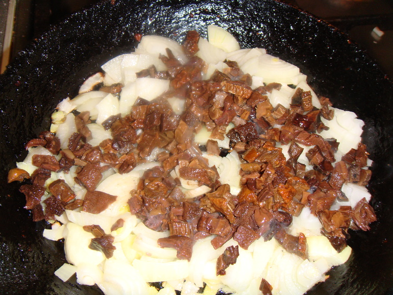 Отварить до готовности с солью. Остудить, нарезать. Спассеровать лук с грибами: