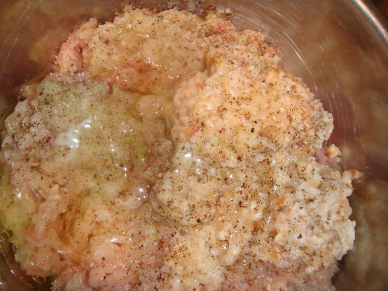 Добавить соль, смесь перцев, белок (или яйцо целиком) вымесить фарш.