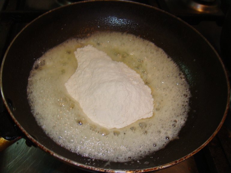 Обжарить 1 ст.л. муки в 2 ст.л. сливочного масла:
