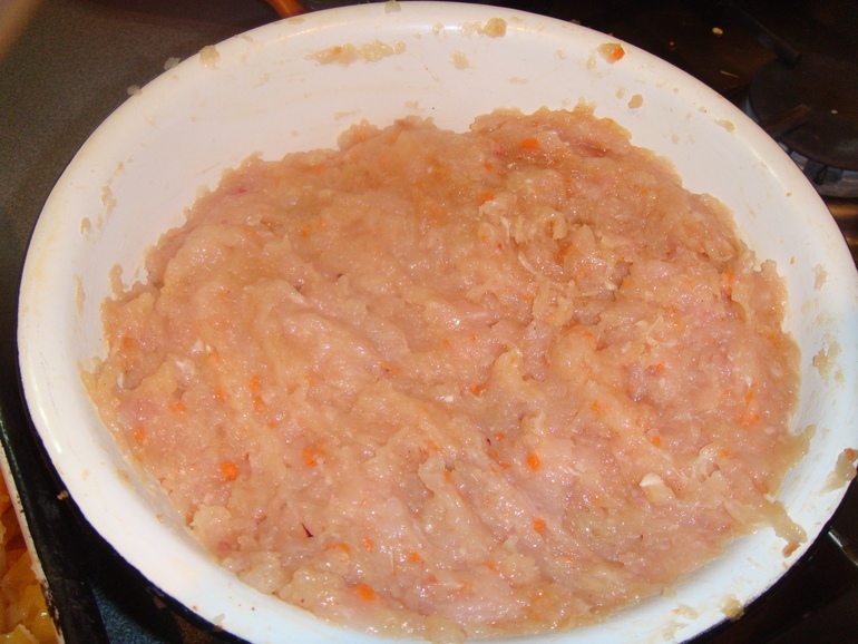 Смолоть курицу или телятину вместе с 1 отварной морковкой и репчатым луком: