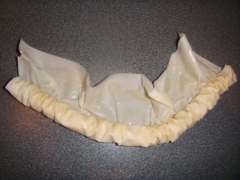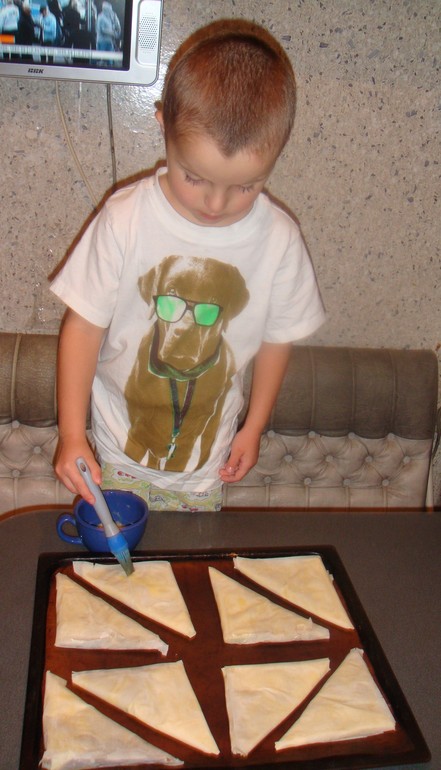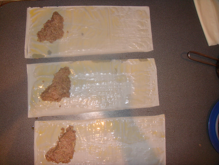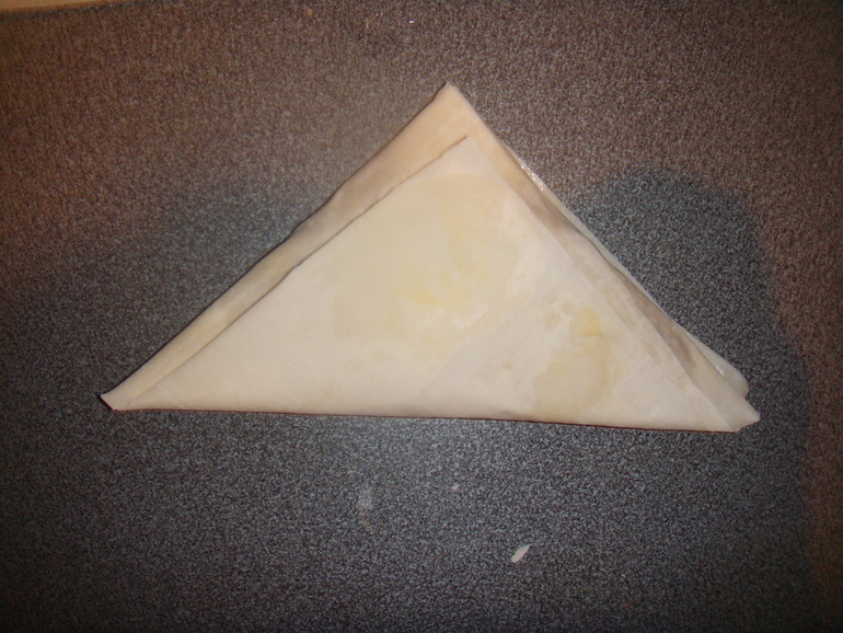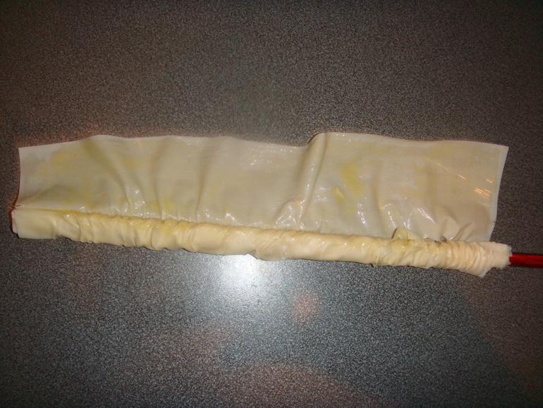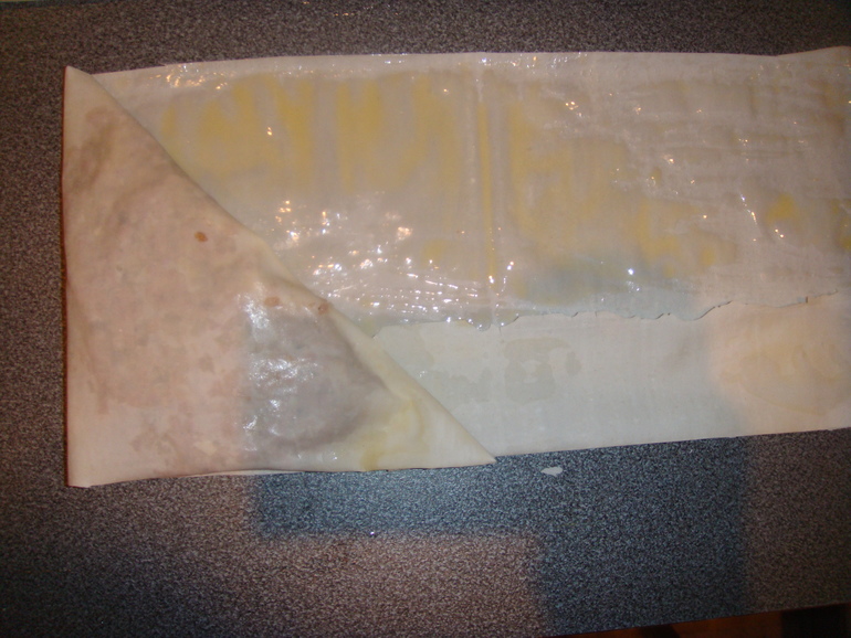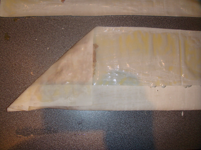 Лист теста Фило смазать тастопленным маслом, разрезать пополам, выложить начинку: