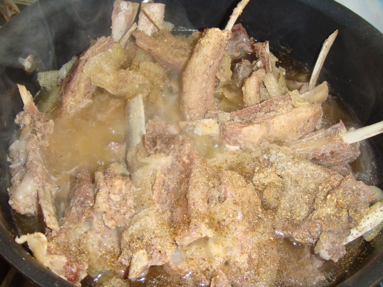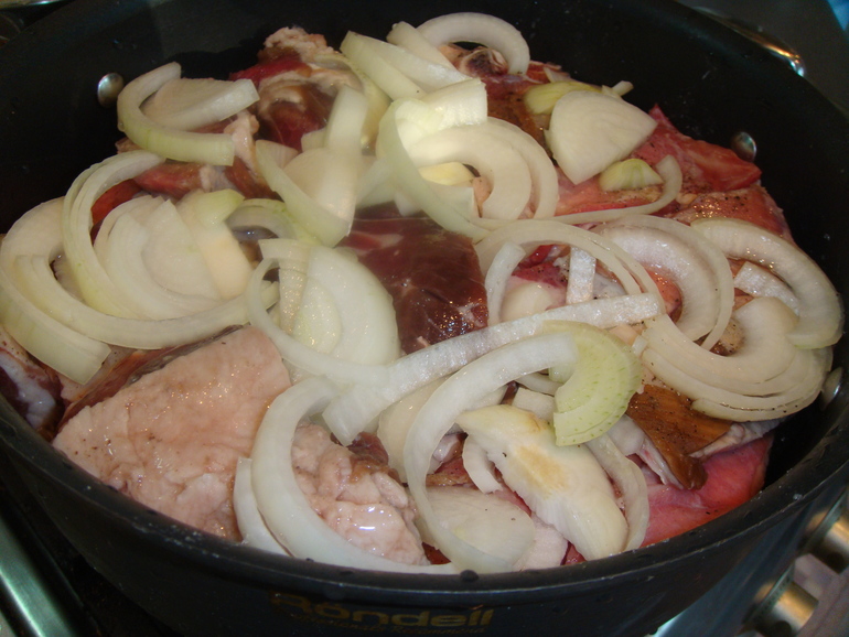 В казан укладывать слоями обжаренную баранину и лук с чесноком и специями: