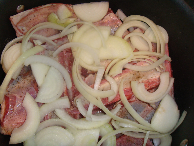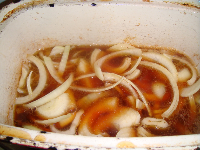 На дно казана положить нарезанный полукольцами лук, залить чаем, слитым с чернослива: