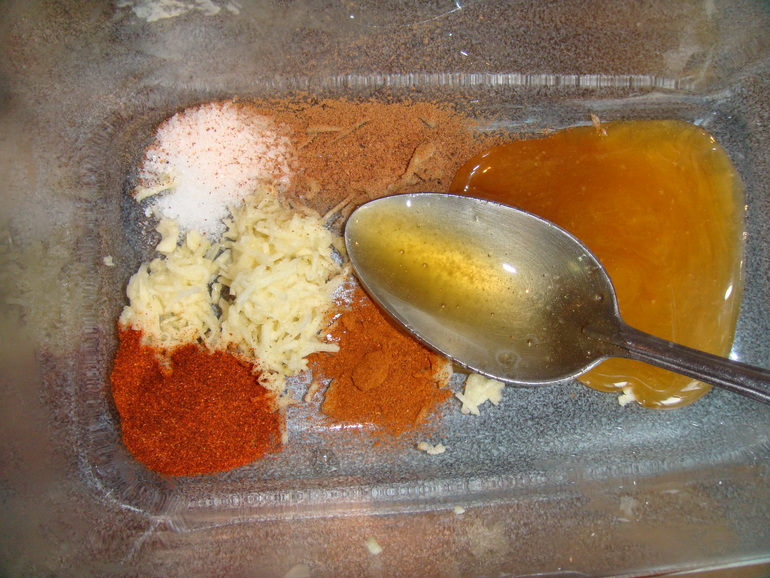 Готовим маринад. Смешать сахар, чеснок, паприку, чили, мед, кориандр: