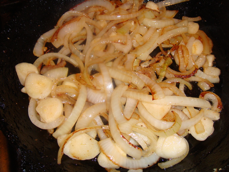 Обжарить еще 2 луковицы в соке от мяса, нарезать чеснок в сковороду: