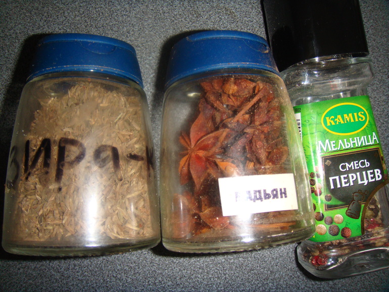Добавить приправы в лук: тмин, майоран, чёрный перец, паприка, розмарин, фенхель, кориандр, лавровый лист, горчица, чабер в сковороду и немного прогреть, чтобы специи "раскрылись".