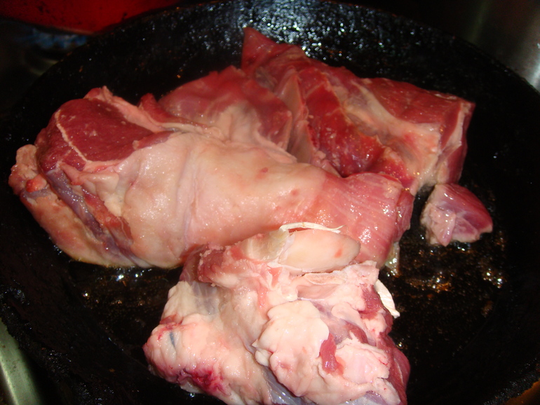 Обжарить баранину на сильном огне до румяной корочки для запечатывания соков: