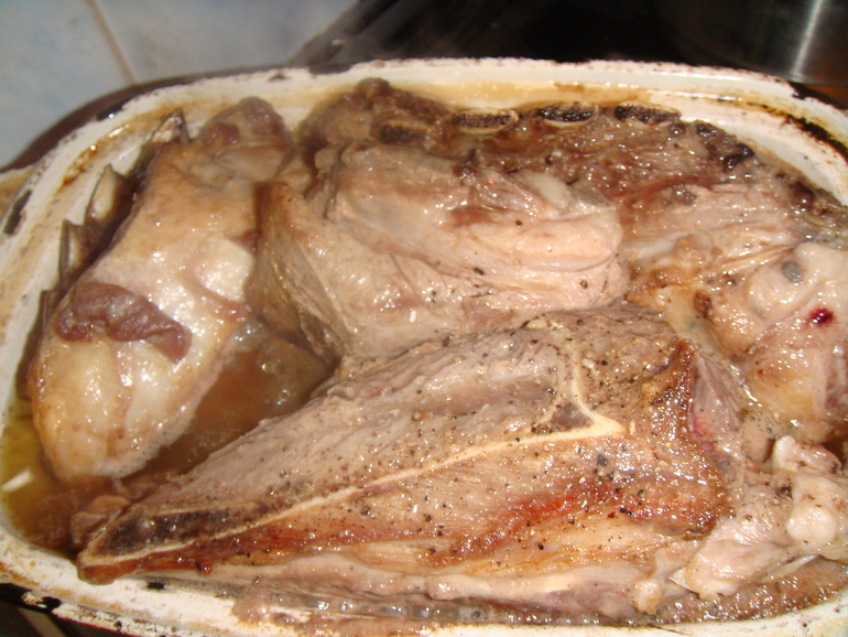 Тушить полтора часа, затем крышку снять, досолить при необходимости и добавить чеснок и лаврик, хмели-сунели. Поставить запекать в духовку: