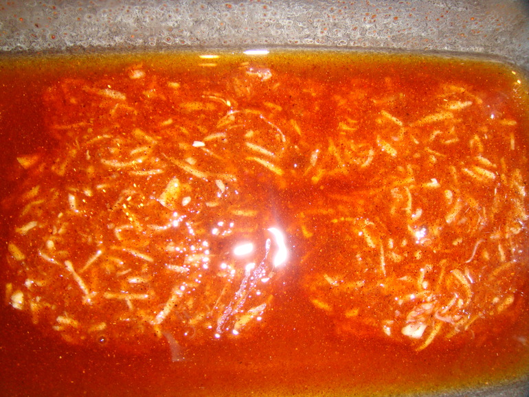 В это время сварить сироп из 2 стакана воды, 1 стакана сахара, половины стакана меда. Туда же положить сок и цедру 1 лимона: