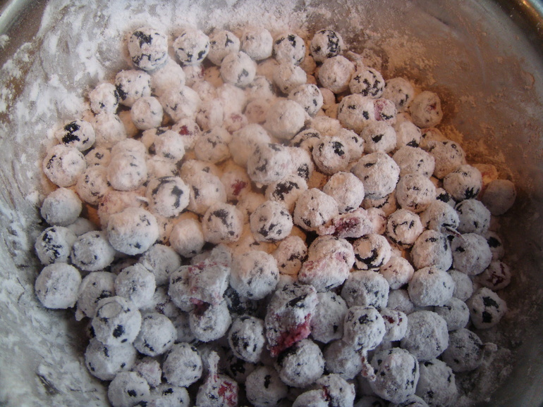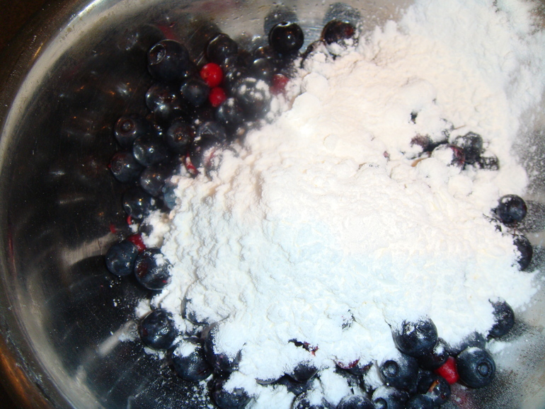 Ягоды промыть, обсушить на бумажной салфетке, засыпать крахмалом, перемешать: