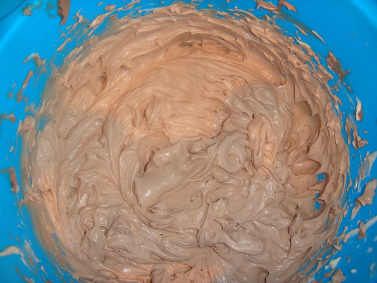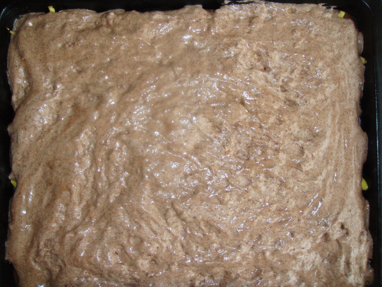Вынуть противень с узором, вылить поверх него темную массу, разровнять: